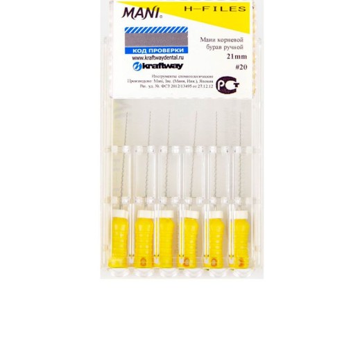 Н-файл № 20 Mani – ручной инструмент, применяемый в эндодонтии, для очистки и расширения зубных каналов. Благодаря длине 21 мм его можно употреблять в разных клинических случаях, в том числе, при работе с изогнутыми профилями.